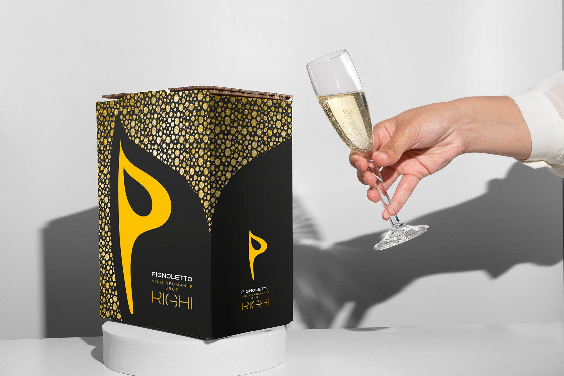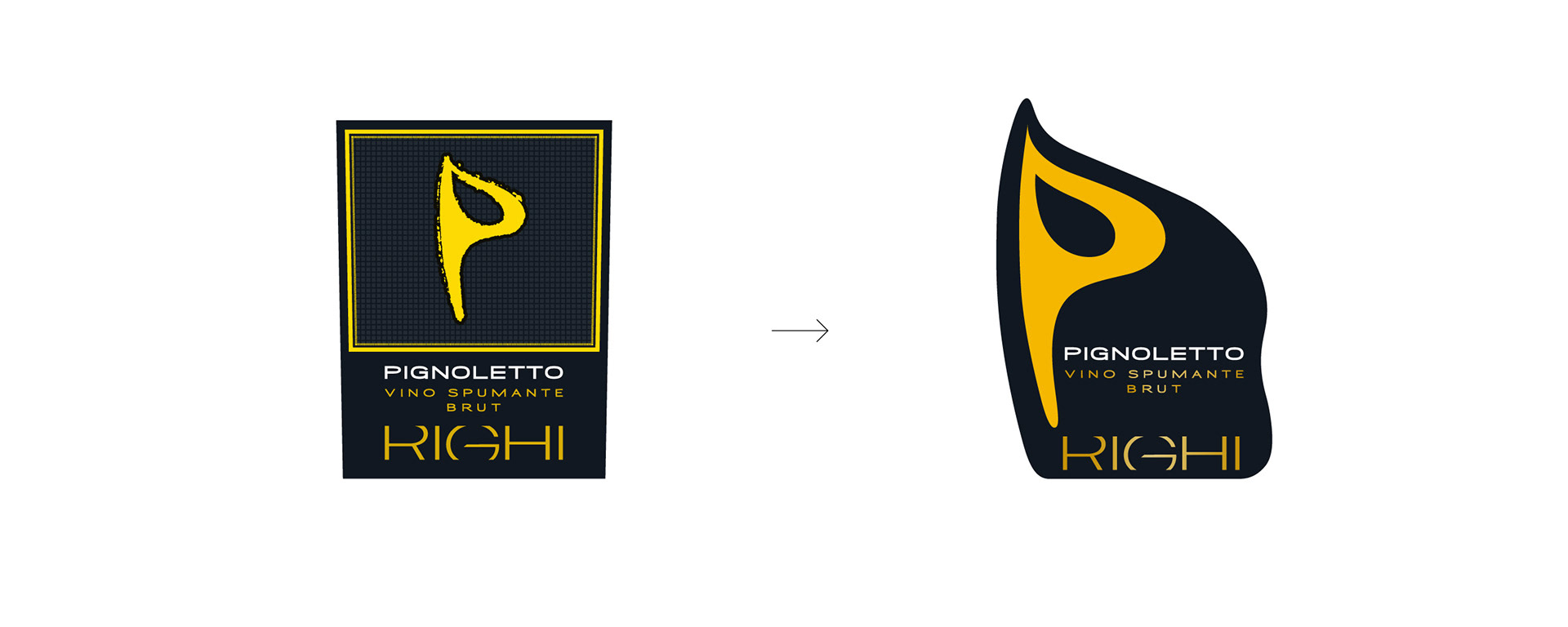 Una P ancora più protagonista che definisce l'etichetta stessa e la sua forma. Le curve sinuose e un utilizzo importante dell’oro abbinato al nero, rendono l’etichetta elegante con un pizzico di sensualità. La texture “bollicine”, ancora più presente sulla scatola, richiama la frizzantezza del vino.